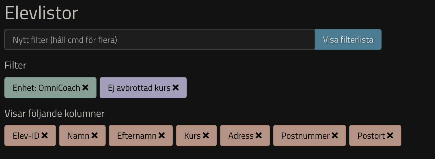 Om ni önskar dra ut en adresslista över studerande kan ni göra det via modulen elevlistor. Där väljer ni önskade filter, observera att vi har lagt dit Ej avbrottad kurs för att endast få aktiva elever: