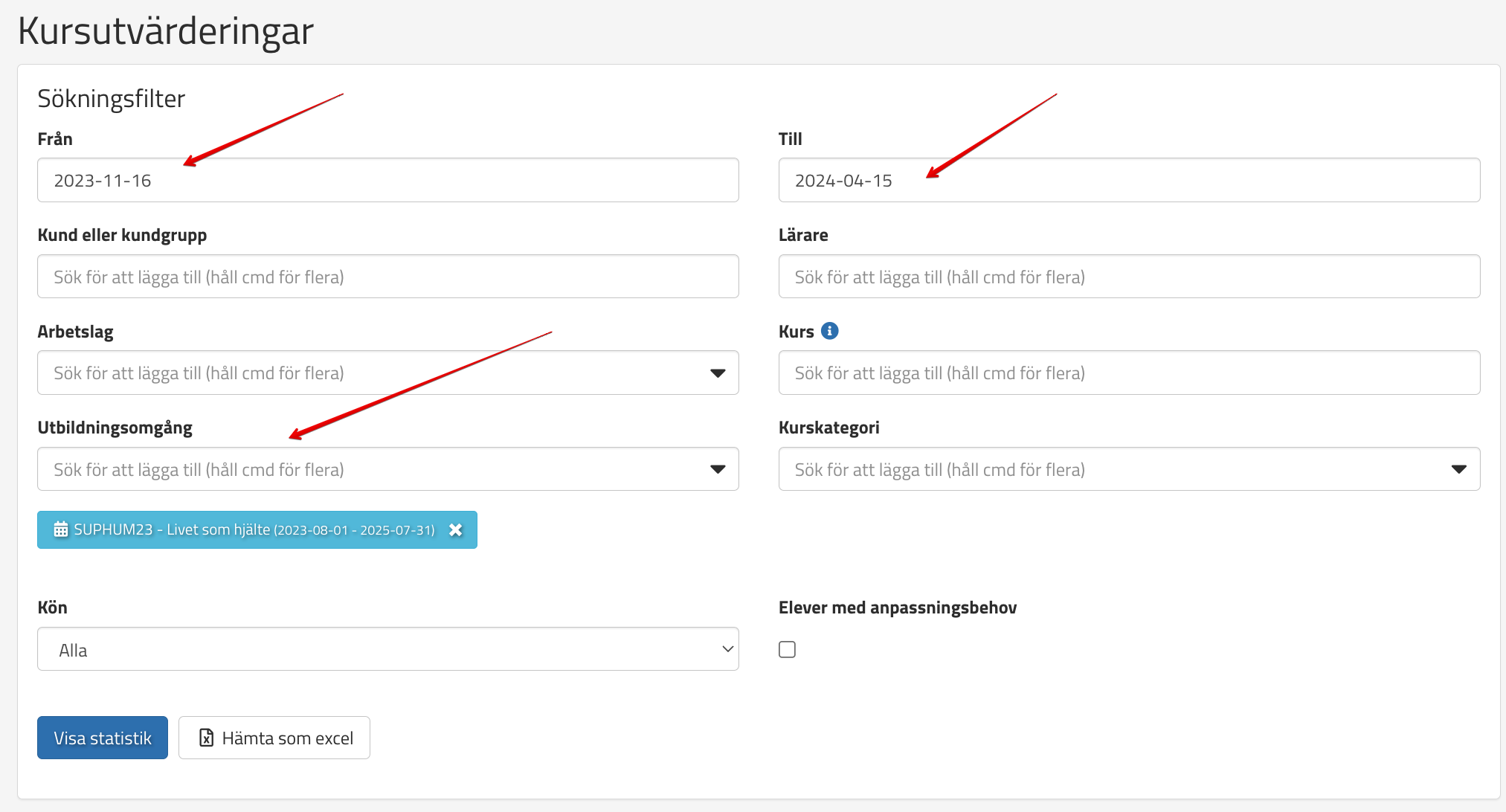 Därefter sätter ni 1:a juli 2024 under rubriken Från och 15 november 2024 under rubriken Till och väljer önskad Utbildningsomgång: