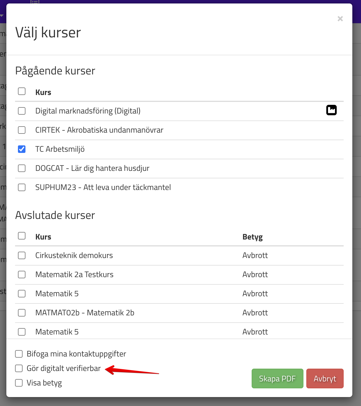 När en användare gör ett utdrag genom att söka upp eleven och väljer Studieintyg så erbjuds möjligheten att göra intyget digitalt verifierbart: