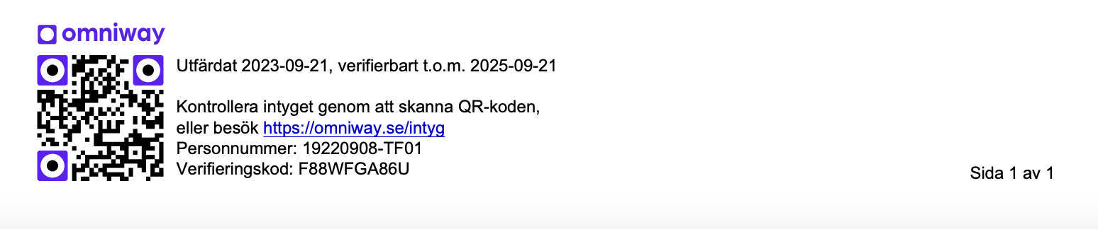 Då kan mottagaren av intyget gå in på länken (https://omniway.se/intyg) och hamnar här: