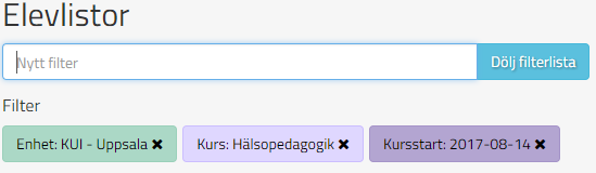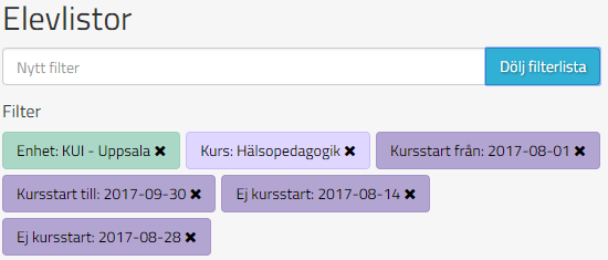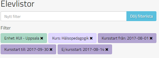 Då lägger jag till filtret "EJ Kurstart:" och klickar i den 14:e Augusti. Då kommer jag ned till 15 elever och min lista med filter ser ut så här: