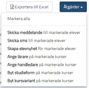 När man har fått fram sin lista så kan man göra några olika åtgärder med dessa elever. Man markerar de elever i listan man vill ändra något på; man kan markera en och en genom att hålla ned CTRL-tangenten, eller markera flera genom att klicka och dra med musen i listan. De åtgärder man kan göra är dessa: