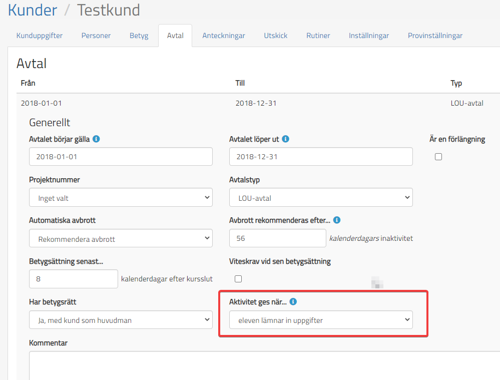 Inställning för Aktivitet görs under modulen Kunder -> Avtal