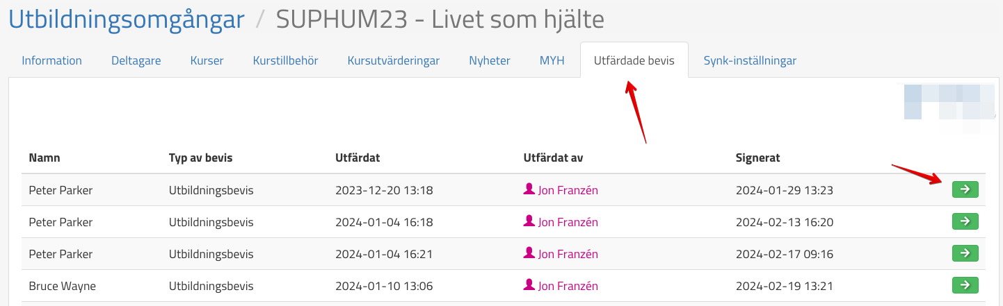 I fliken Utfärdade bevis i Utbildningsomgångar listas alla utfärdade bevis på utbildningen. Genom att trycka på den gröna pilen så laddas beviset ned: