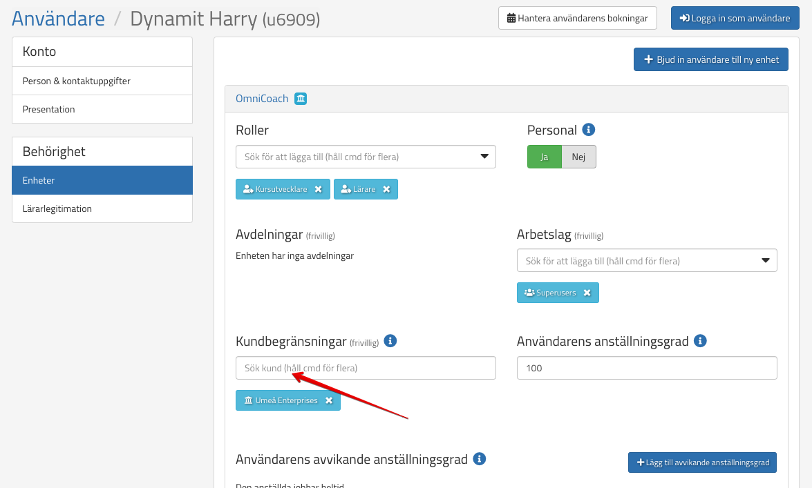Sök rätt på användaren genom Användarlistan eller Sökfunktionen, lägg sedan till den ort som de studerande kommer ifrån och tryck på Spara enhetskoppling: