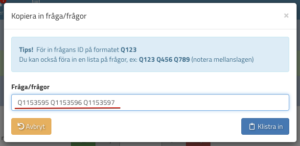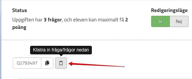 Via knappen nedan så går det att klistra in en frågas ID från en annan uppgift så att innehållet även kommer till denna uppgift. Det går även att klistra in flera frågor samtidigt om användaren använder ett mellanslag mellan frågornas ID.