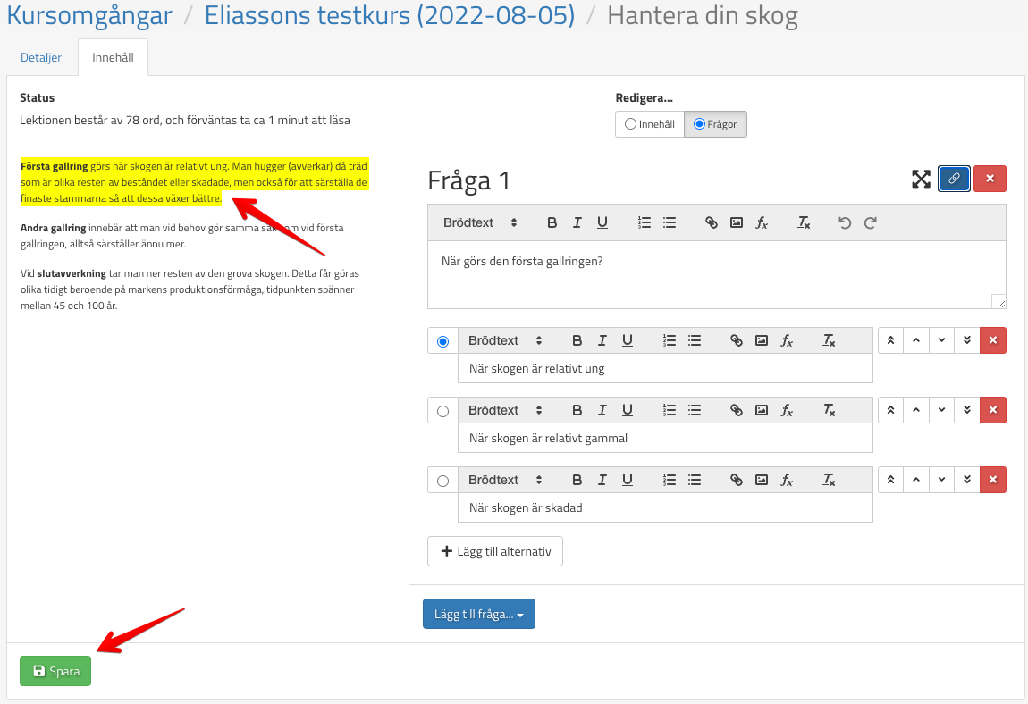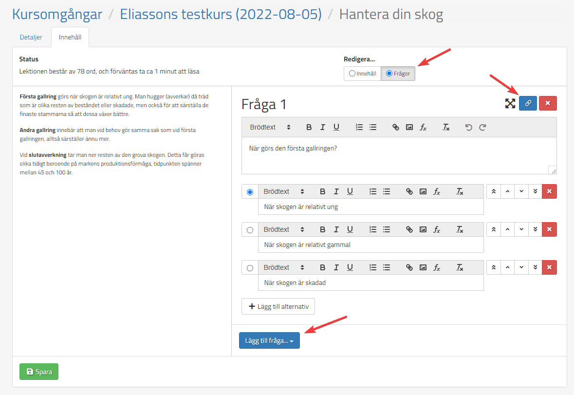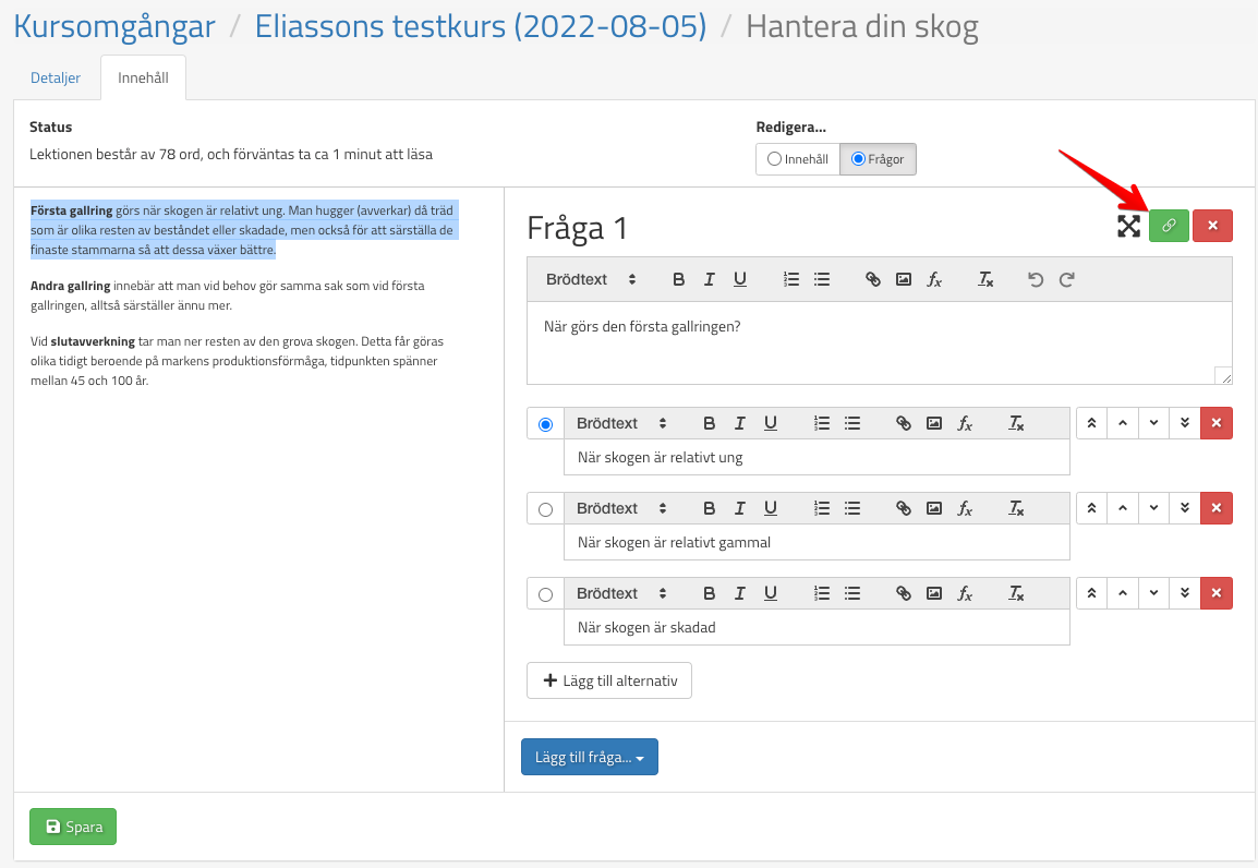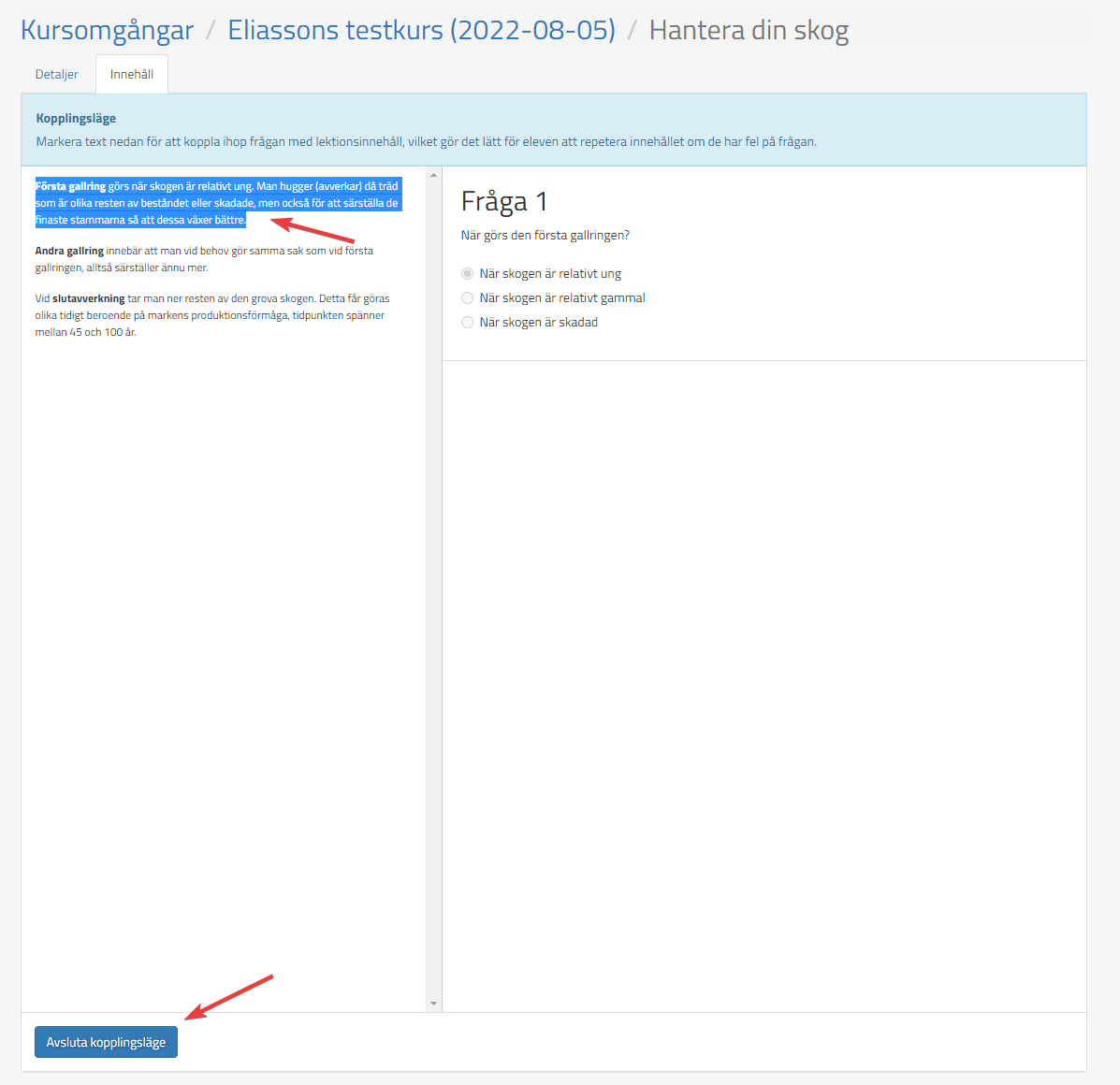 Därefter klickar du på "Koppla till lektionsinnehåll" en gång till för att knyta den markerade texten till frågan.