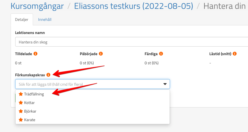 Om du ställer in att lektionen Hantera din skog har förkunskapskrav: Trädfällning, så kommer de studerande inte kunna öppna lektionen förrän de är godkända på Trädfällning