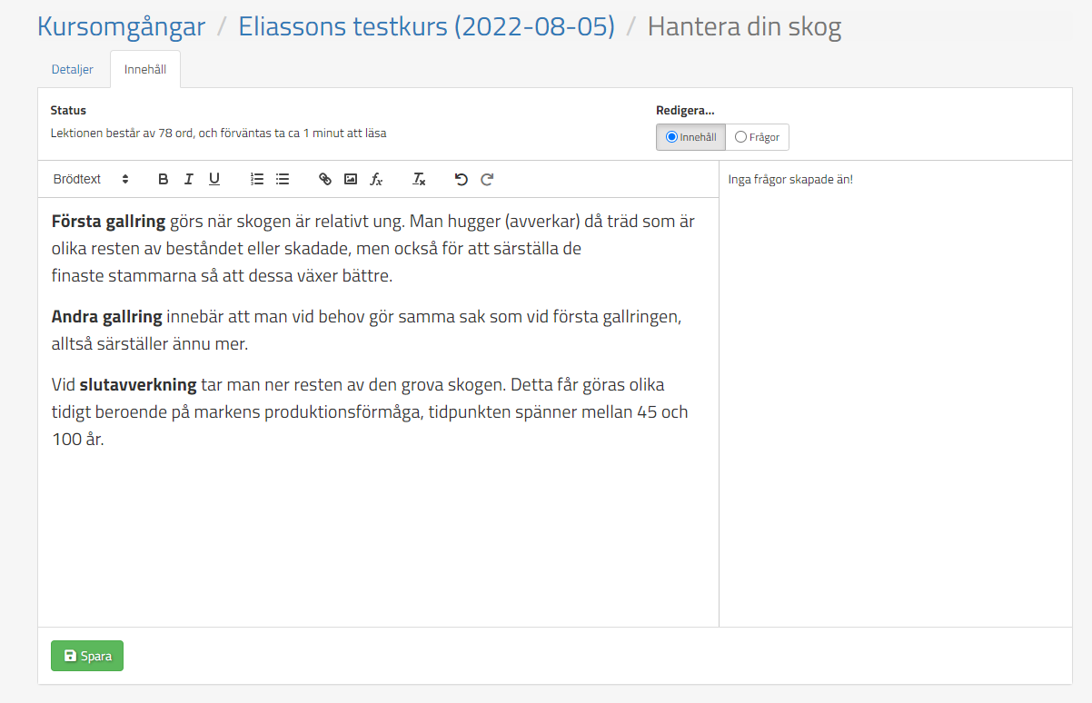 När du skapat en lektion får du först fylla på med innehåll, alltså den information de studerande ska ta till sig.
