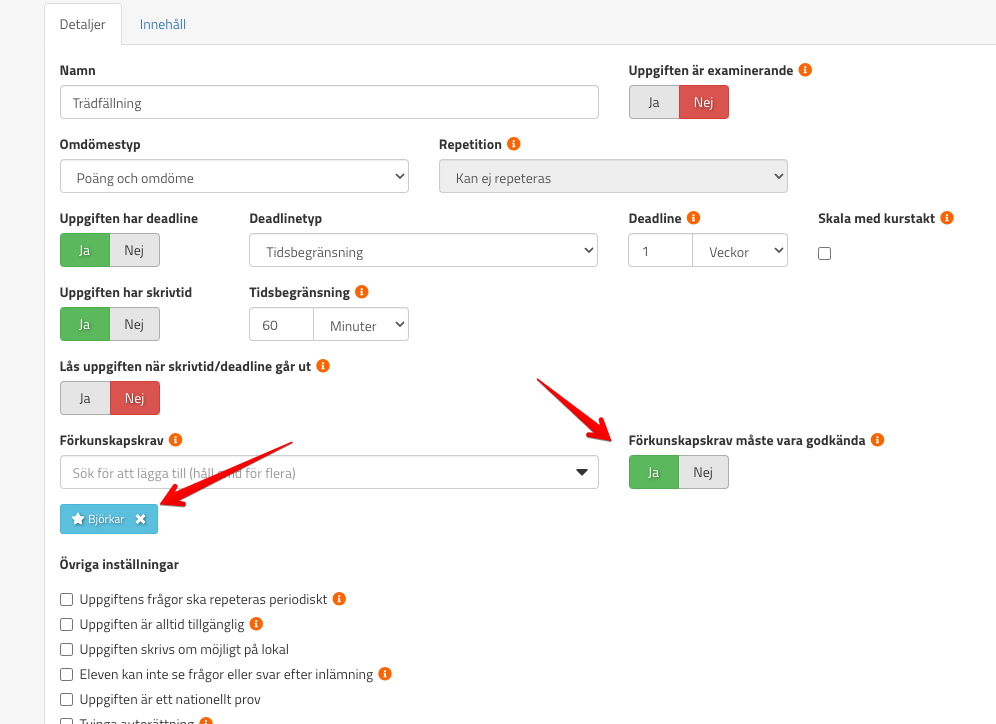 Observera att du behöver kryssa för att Förkunskapskrav måste vara godkända. Annars räcker det att uppgiften lämnas in, oavsett resultat. För att lektioner ska registreras som godkända måste samtliga frågor vara korrekt besvarade.