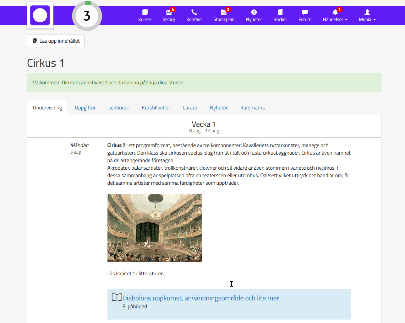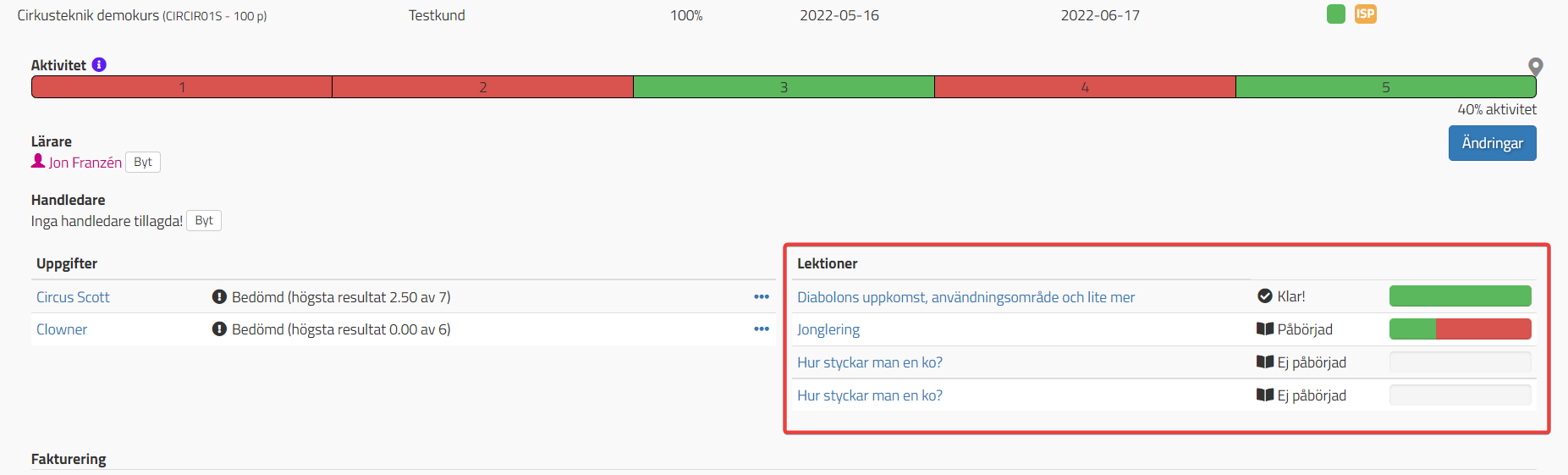 På de studerandes sida får du en överblick över hur det har gått på lektionerna. Alla frågor på lektionen måste vara besvarade rätt för att lektionen ska bli klar(helt grön).