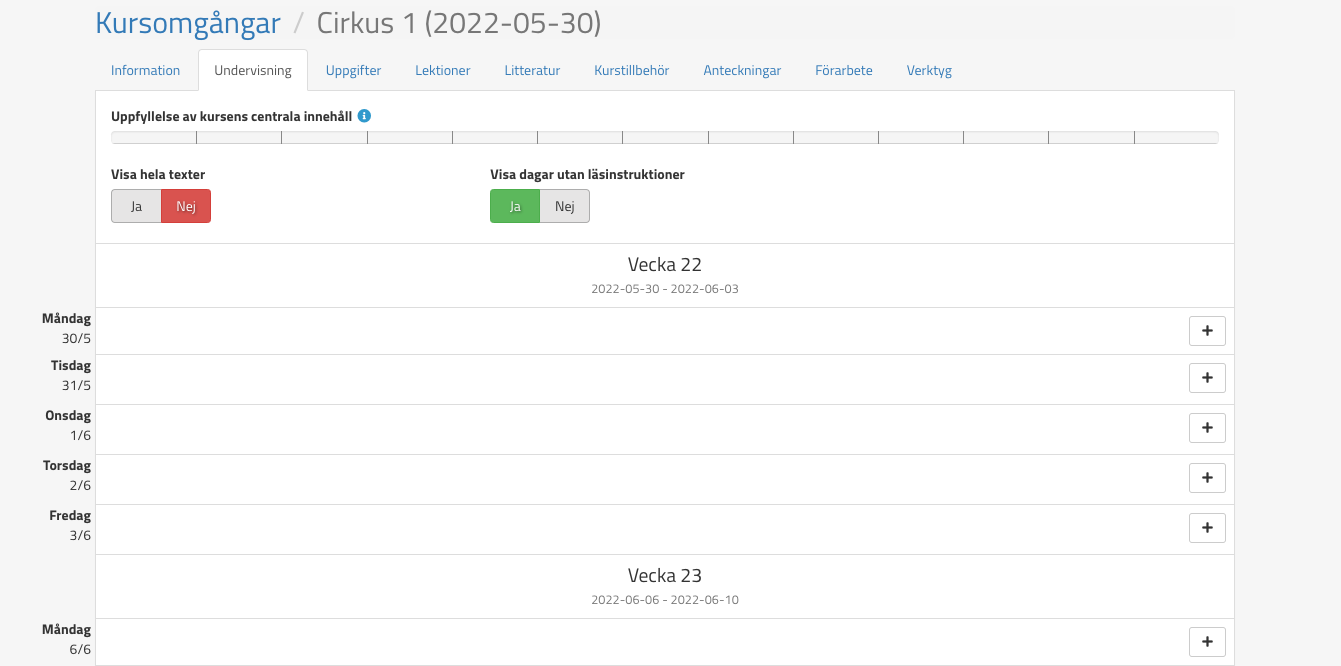 En kursomgång är en kurs som hålls på fasta datum, d.v.s. mellan ett start- och slutdatum. En kursomgång kan t.ex. vara lämplig att använda när det är en kurs som läses av en klass. I fliken undervisning kan användaren se exakt vilket datum läsinstruktionen hamnar på. Exempelbild nedan: