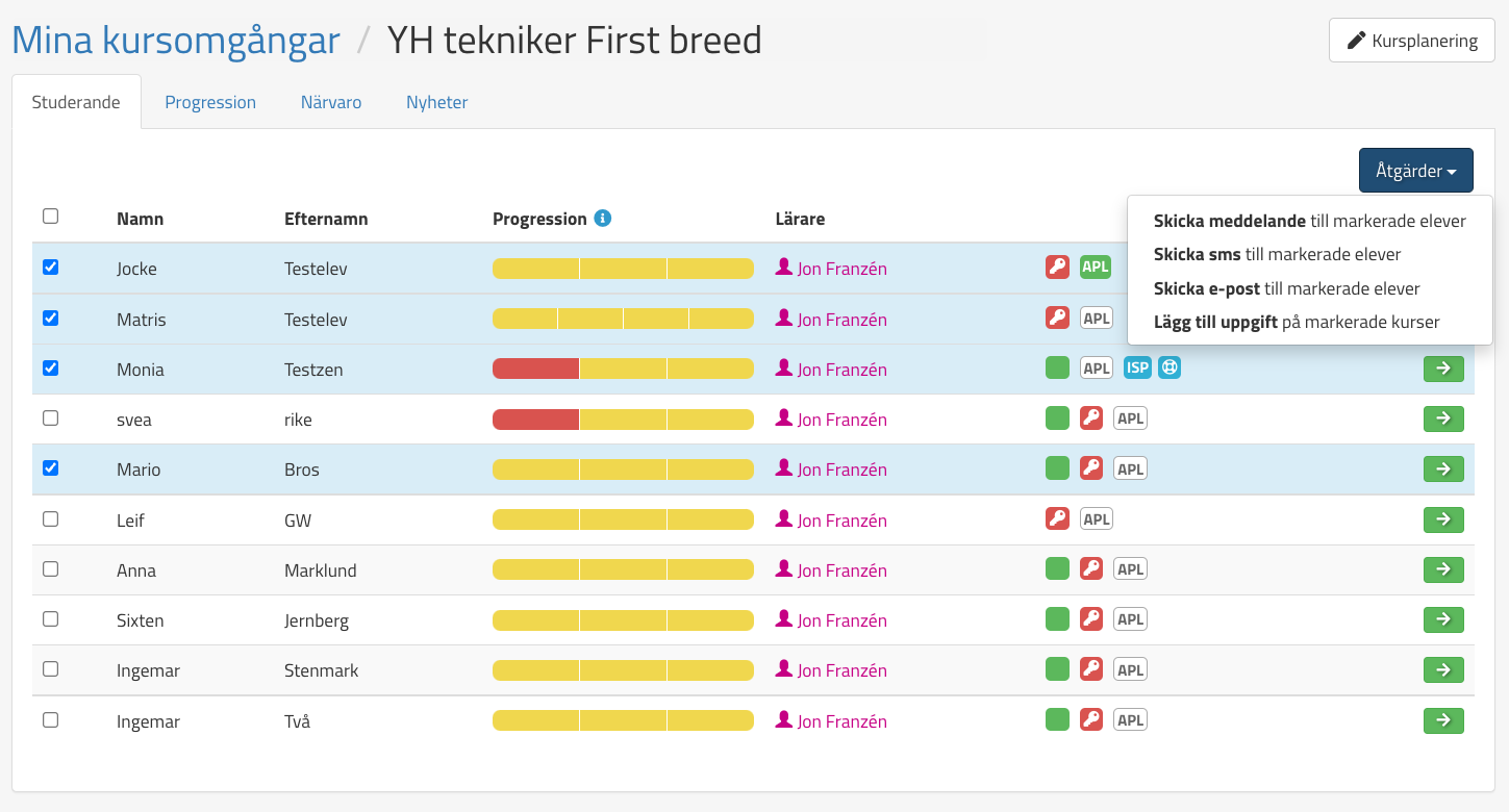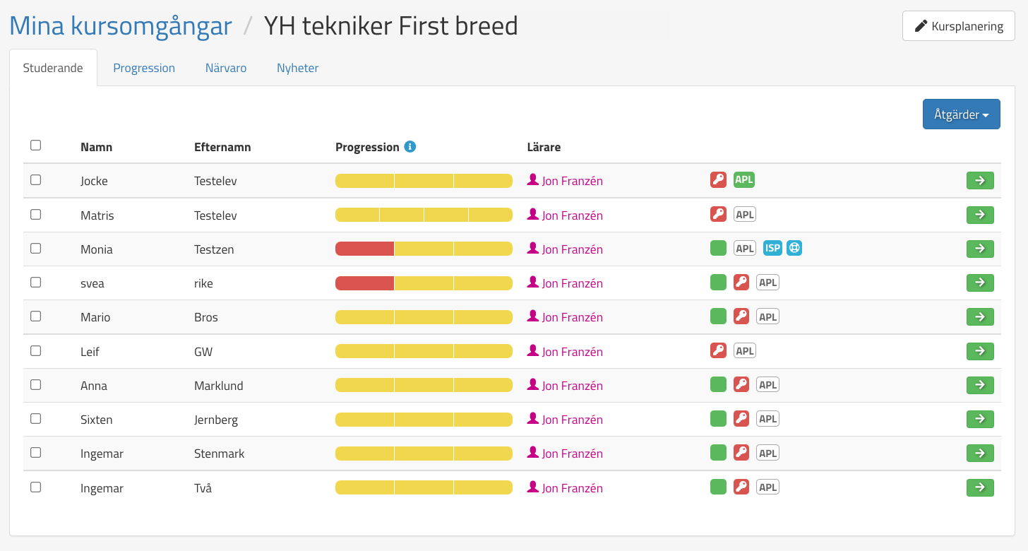 När det finnas elever/studerande registrerade på kursomgången så kommer användaren åt kursomgången via Mina kursomgångar. Där visas en detaljerad lista över de studerande och deras progression. Exempelbild: