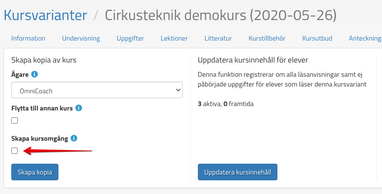 Från en kurs som finns under kursvariantslista går det att skapa en kursomgång av den. När ni gör detta så behöver ni kika igenom fliken undervisning för att se så att läsinstruktioner och uppgifter är där ni önskar ha dem.