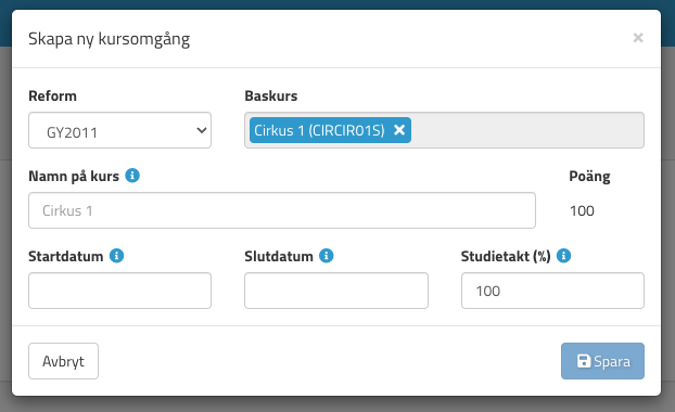För att skapa en kursomgång, gå till modulen Kursomgångslista och tryck på Ny kursomgång uppe i det högra hörnet. Då visas detta fönster: