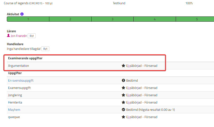 För att lätta få en överblick över elevens uppgifter går det nu att markera en uppgift som examinerande. Då kategoriseras uppgifterna enligt exemplet nedan: