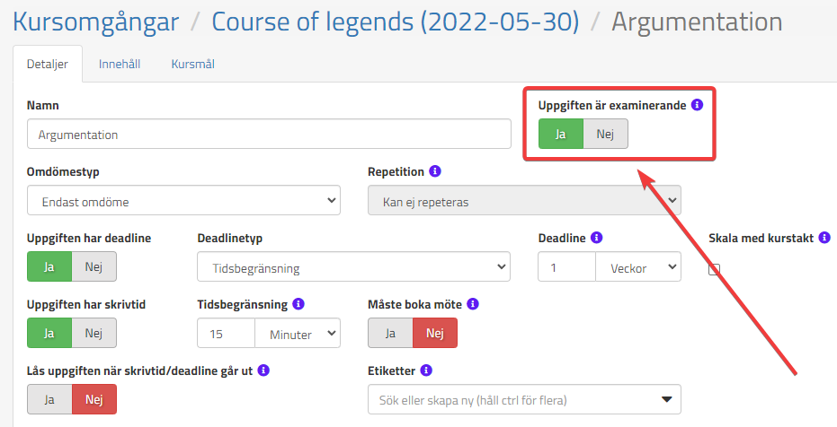 För att markera en uppgift som examinerande går ni in på uppgiften och väljer att den ska vara det: