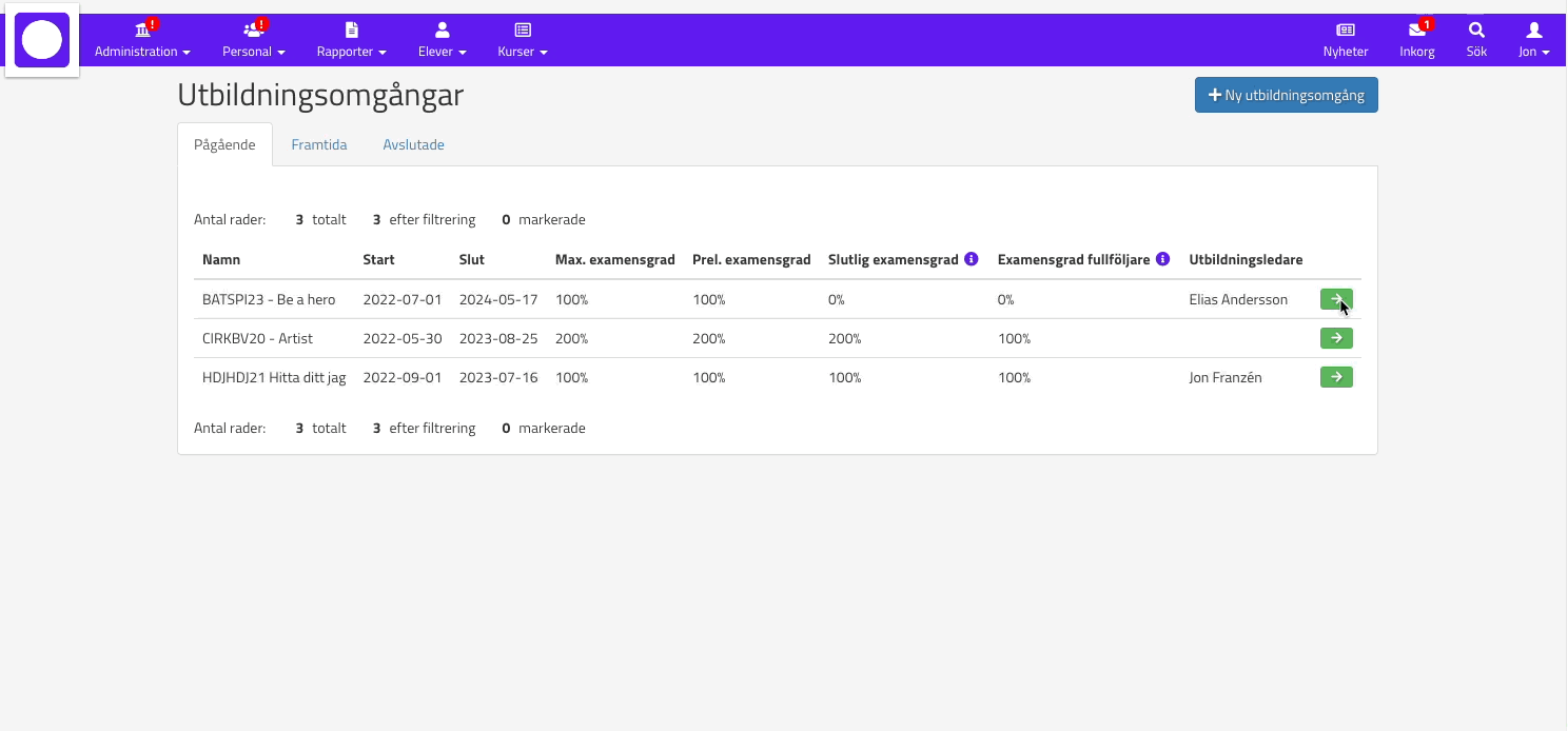 För att få en bra överblick över vilka studerande som ligger efter i en utbildningsomgång kan ni arbeta så här i Omniway.