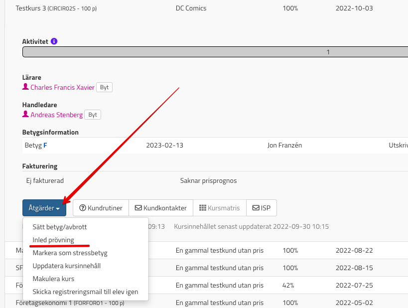 När en kurs är avslutade och den studerande har fått ett betyg så går det inte att se eller lämna in uppgifter på kursen för den studerande. För att "öppna" upp kursen igen för den studerande så inleder ni en prövning på kursen. Gå in på den studerandes sida, välj önskad kurs, Åtgärder och Inled prövning: