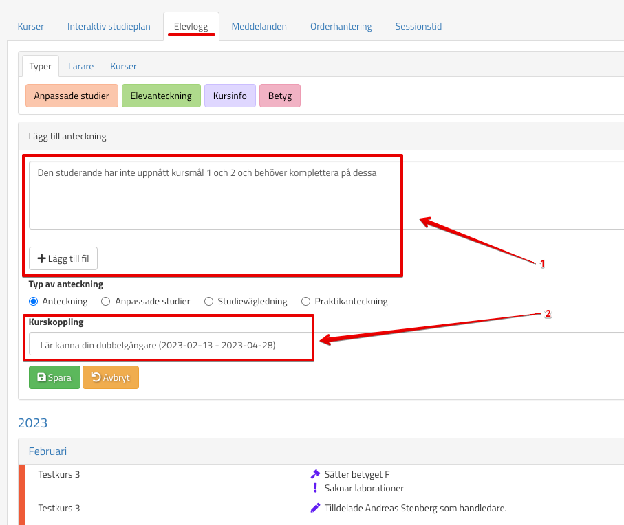 I samband med att ni gör detta är det även bra om ni lägger en kommentar i elevloggen där ni beskriver åtgärdsplanen(1). Glöm inte att kurskoppla(2) din anteckning så att det blir lättare att hitta informationen senare: