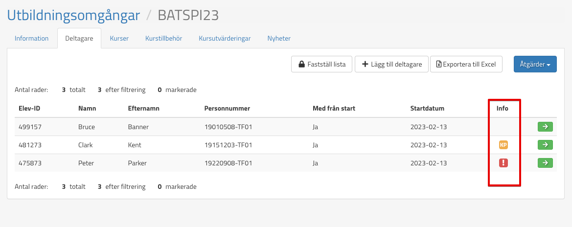 Då kommer systemet i fliken Deltagare under utbildningsomgångar signalera ett rött utropstecken för att visa att godkänt betyg saknas på en eller flera kurser. Se bild nedan: