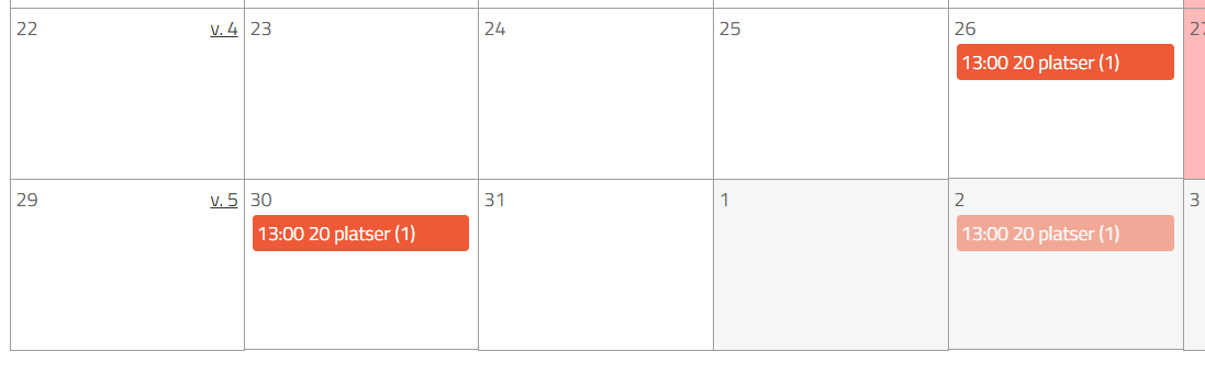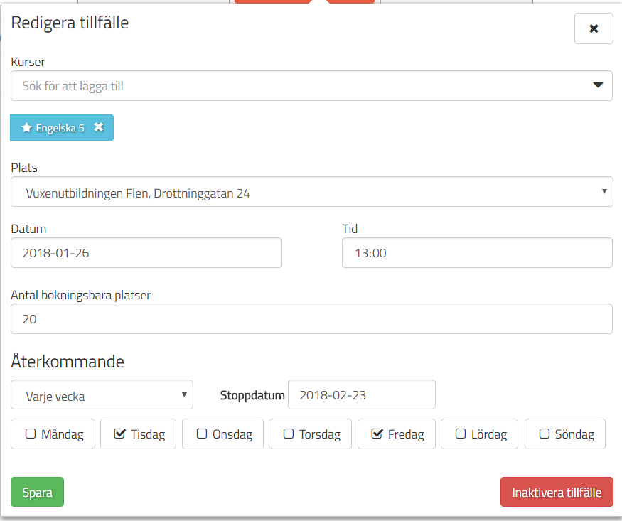 Om jag klickar på "Inaktivera detta tillfälle" så tas det bort. Om jag klickar på "Visa återkommande tillfälle" så kommer man tillbaka till rutan där man redigerar hela kedjan med provtillfällen. Jag väljer att inaktivera det och sen klickar jag på "Spara". Då ändrar den färg och blir blek:
