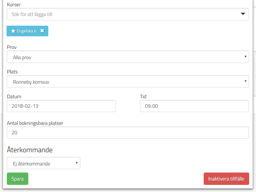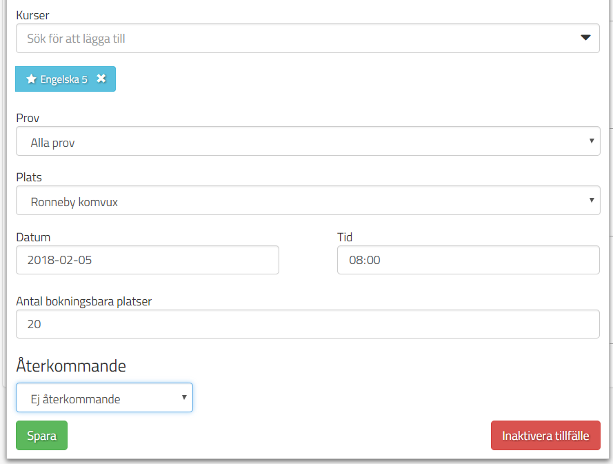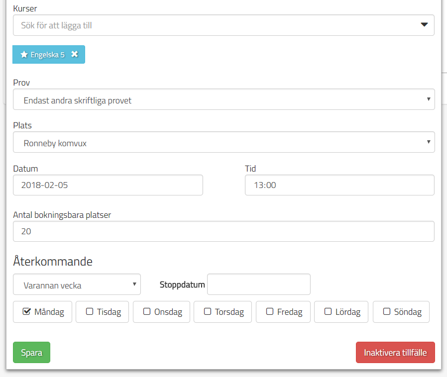 Skapa återkommande provtillfällen för slutprov på lokal