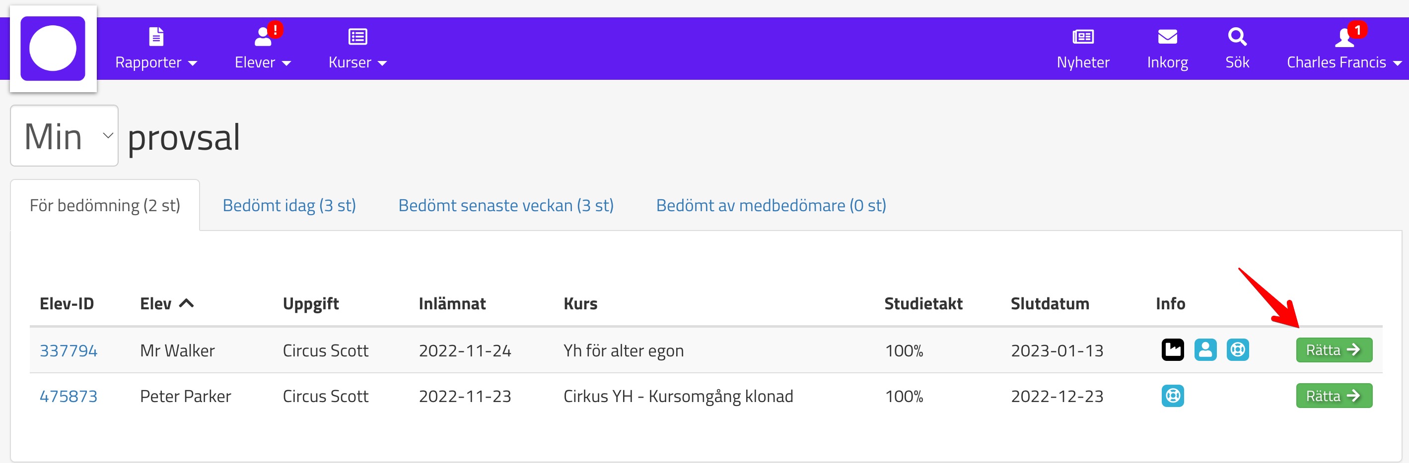 I provsalen ser ni tydligt vems uppgift det är och när den lämnades in. För att rätta uppgiften klickar ni här: