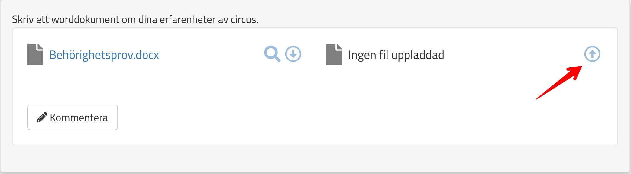 Om ni har med "Filuppladdning" så att de studerande kan ladda upp filer som svar på en uppgift, kan ni ladda ner den, göra kommentarer i dokumentet och sedan ladda upp en återkopplingsfil så att de studerande kan ta del av era kommentarer i dokumentet: