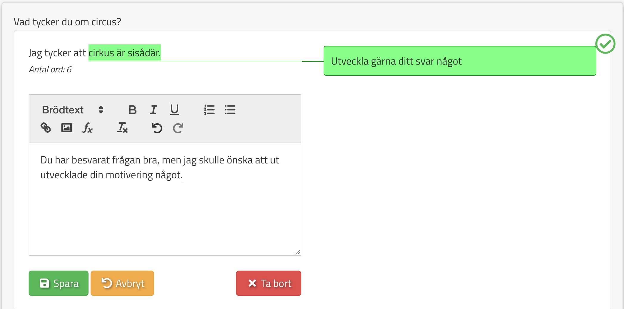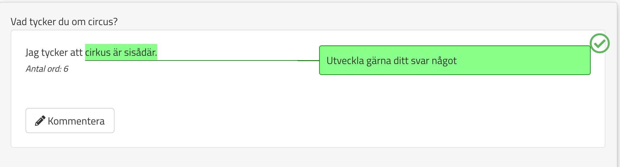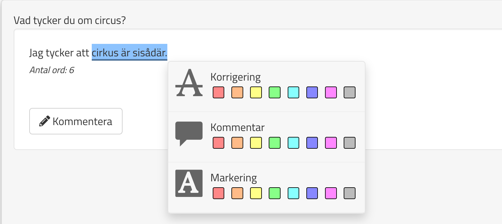 När ni väl ska rätta uppgifter kommer ni kunna kommentera och markera i den text de studerande skrivit. Det gör ni genom att markera en del av texten och sedan välja något av alternativen: