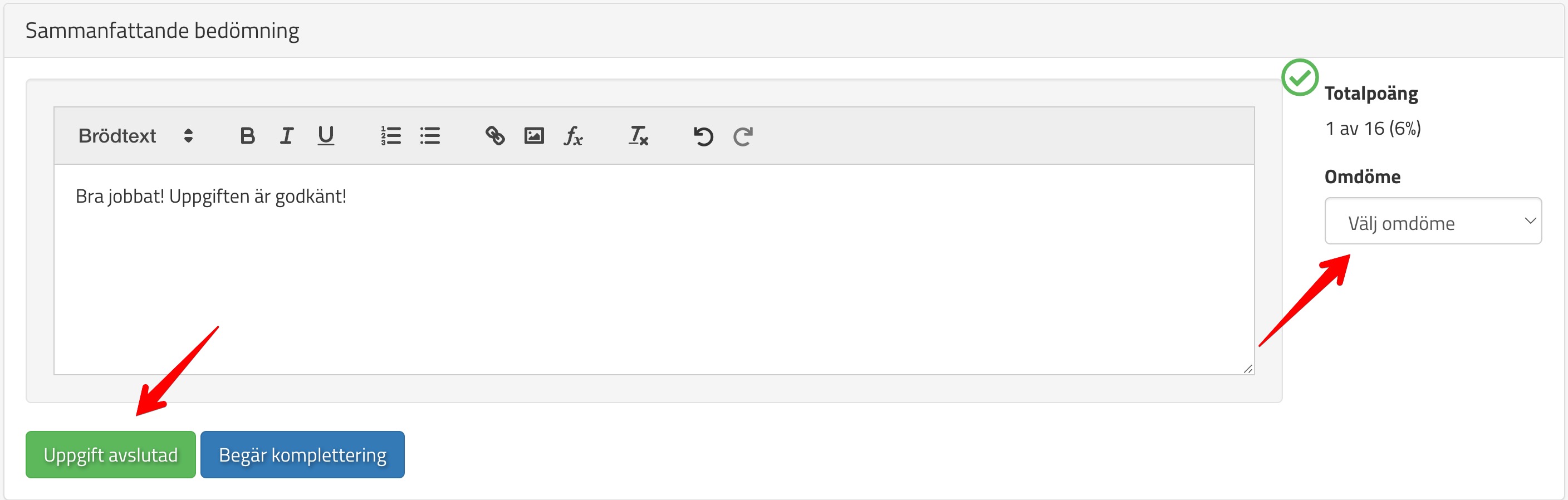När ni är färdiga kan ni lämna en sammanfattande kommentar som gäller för hela uppgiften och sätta ett betyg på uppgiften innan ni slutligen klickar på: Uppgift avslutad: