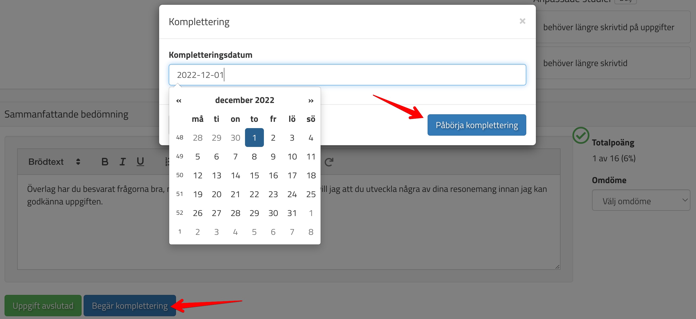 Om ni bedömer att den studerande behöver komplettera något för att uppgiften ska bli godkänd väljer ni: Begär komplettering och sedan när deadline för kompletteringen ska vara: