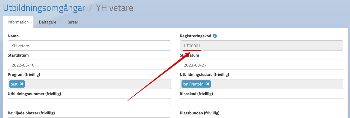 Varje utbildningsomgång har en unik registreringskod, den hittar ni på utbildningsomgången: