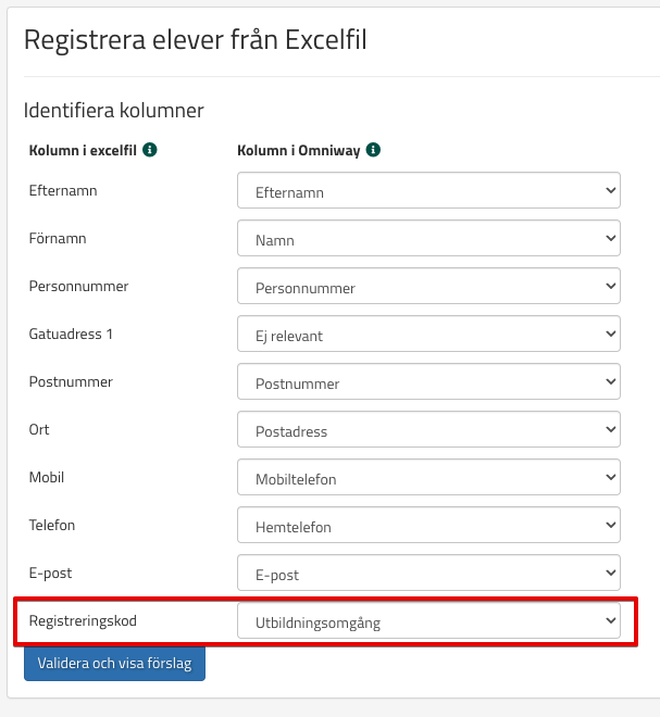 Kolumnen i excelfilen som innehåller Registreringskoden för utbildningsomgången heter med fördel Utbildningsomgång. I bildexemplet ovan heter kolumnen i excelen Registreringskod. Då behöver ni välja att den ska mappas mot utbildningsomgång.
