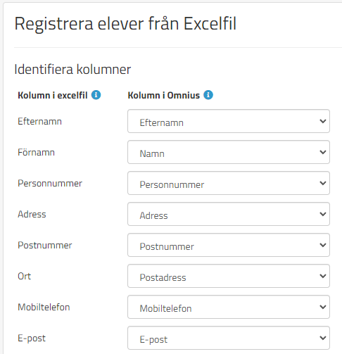 Här så är de förbestämda delarna i systemet till höger och de olika kolumnrubrikerna till vänster. Kontrollera att kolumnen från excelfilen matchar mot kolumnen i Omniway. Om det är en kolumn i excelfilen som inte ska in i systemet, välj Ej relevant för den kolumnen.