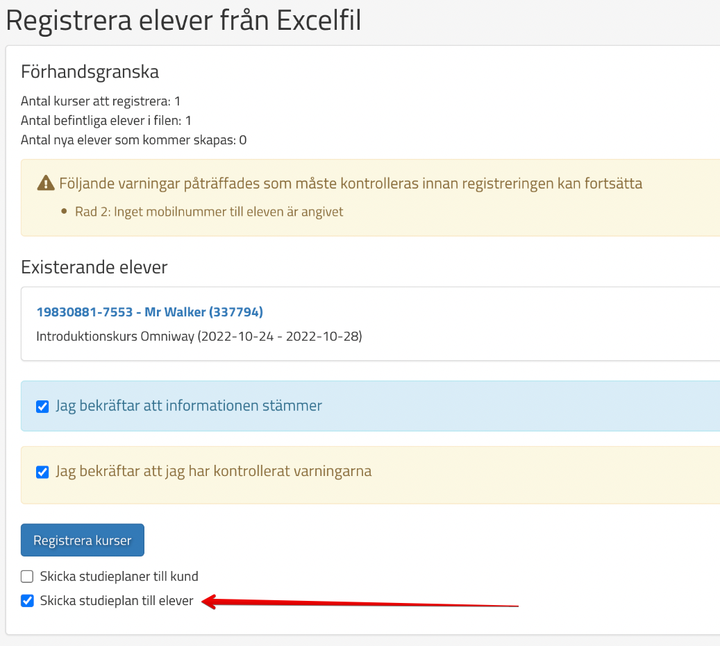 Se till att Skicka studieplan till elever är ikryssad så att de får ett registreringsmejl.