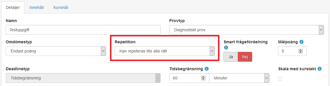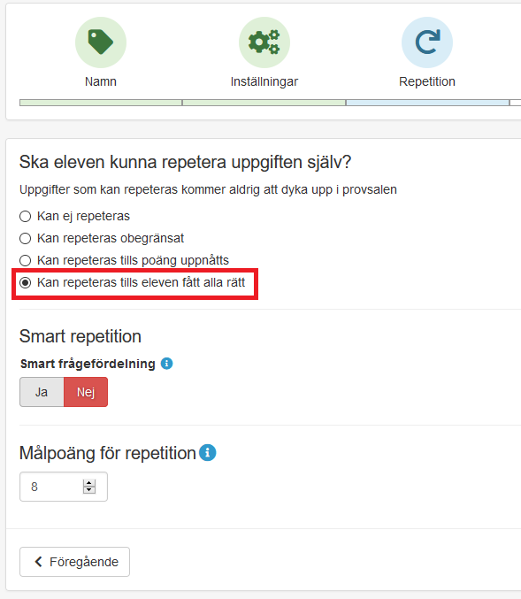 Nu finns det när du skapar uppgifter en ny inställning gällande repetition: du kan välja att låta eleven repetera uppgiften tills den är godkänd eller perfekt. Det innebär att eleven räknas som godkänd när den uppnår den angivna poängen, men eleven kan ändå fortsätta att repetera uppgiften tills maxpoäng är uppnådd.