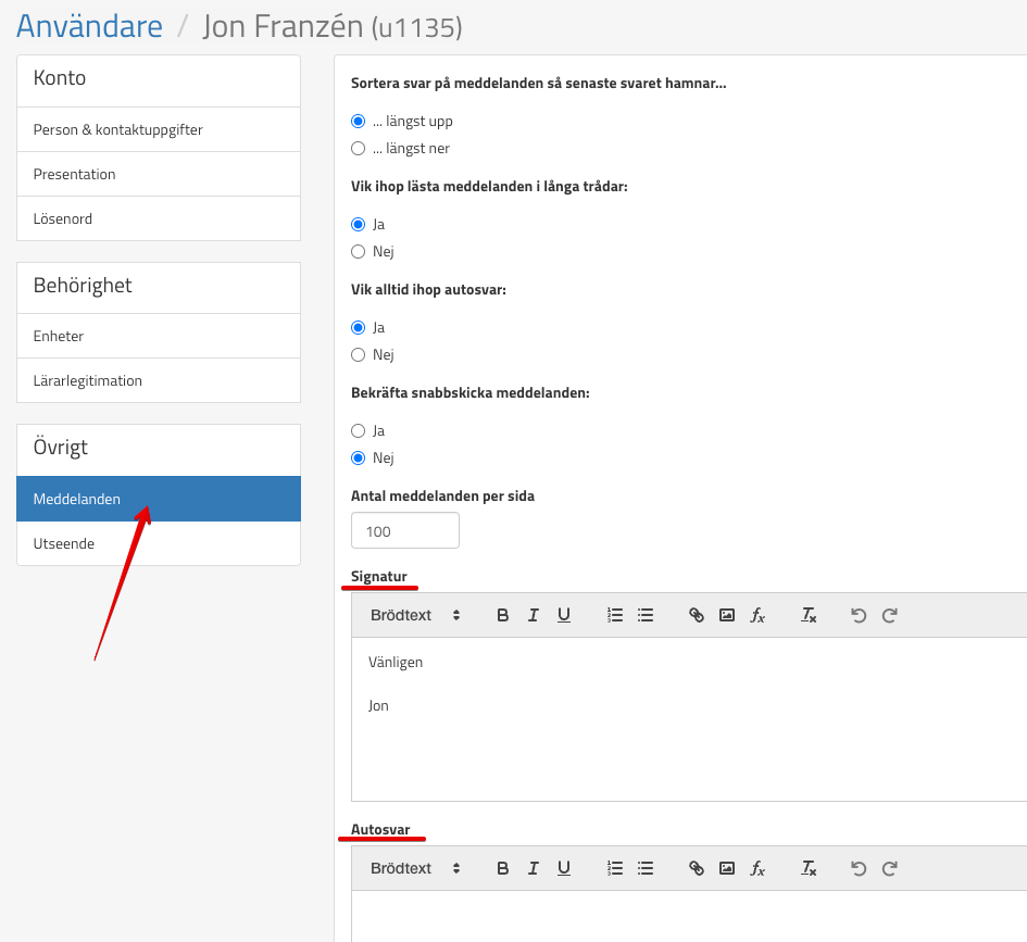 Signatur och autosvar Uppdaterad 2026-03-23 Ni lägger till signatur och autosvar på sidan Min användare och rubriken Meddelanden