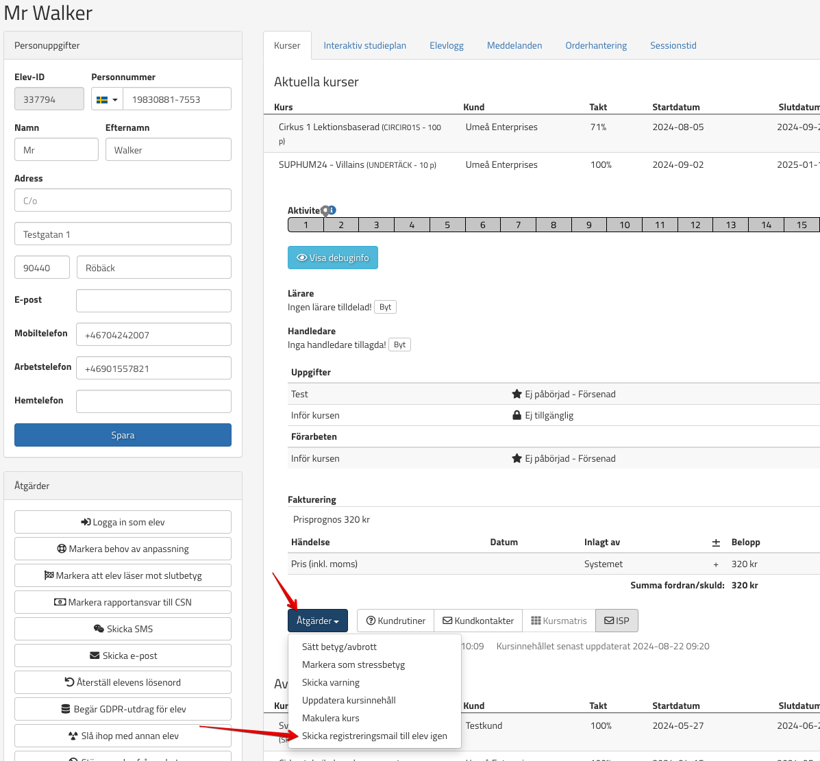 2. Skicka om inbjudningsmeilet genom att gå till elevkortet, klicka på kursen, välja Åtgärder och Skicka registreringsmail till elev igen. Se bild nedan: