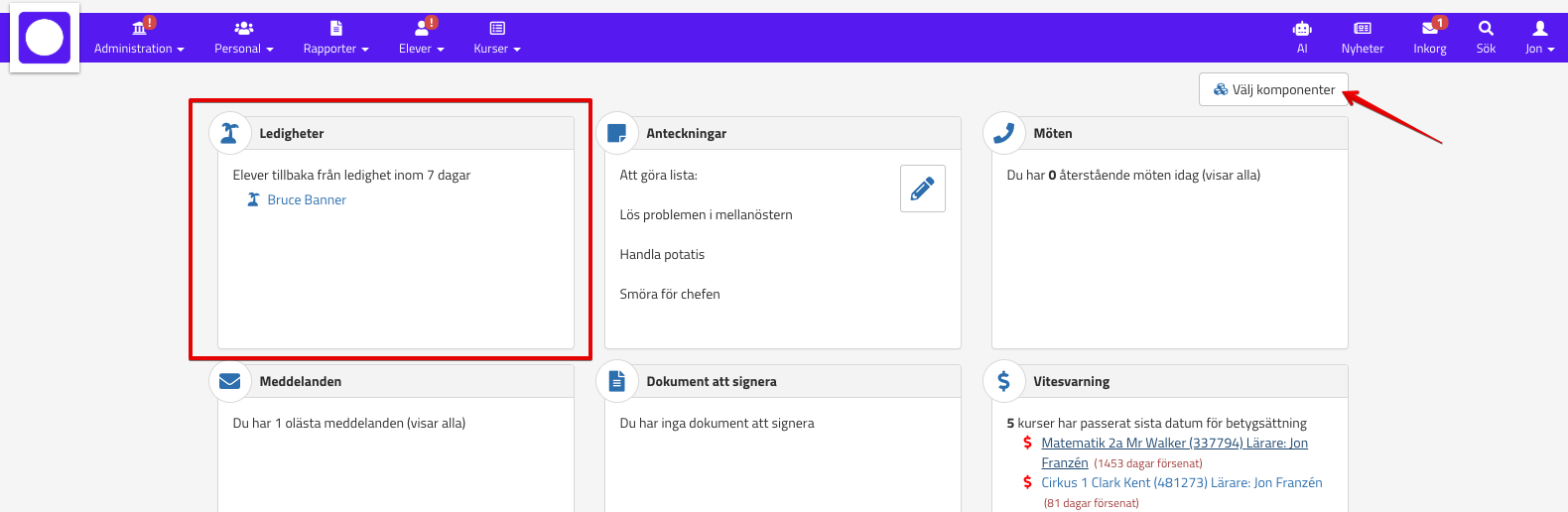 Ni kan med fördel aktivera startsidekomponenten Ledigheter. Den visar elever som kommer tillbaka från ledighet (studieuppehåll) inom 7 dagar. Om användaren har tillgång till alla utbildningsomgångar på enheten så visar komponenten alla elever som kommer tillbaka från ledighet, annars visar den bara för de utbildningsomgångar som användaren är utbildningsledare på. För att lägga till den klickar ni på Välj komponenter på startsidan: