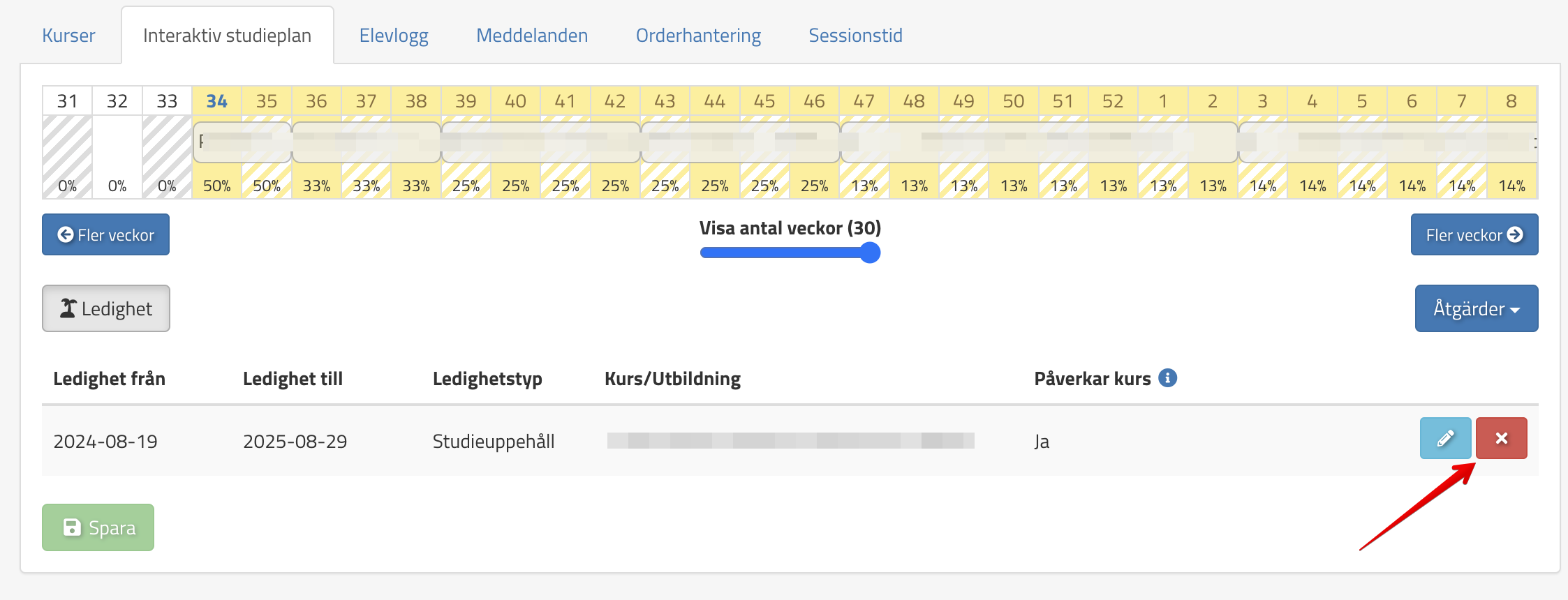 Om ni önskar ta bort en ledighet som den studerande har fått söker ni rätt på den studerande, väljer fiken Interaktiv studieplan och väljer det röda krysset för att ta bort ledigheten, se bild nedan: