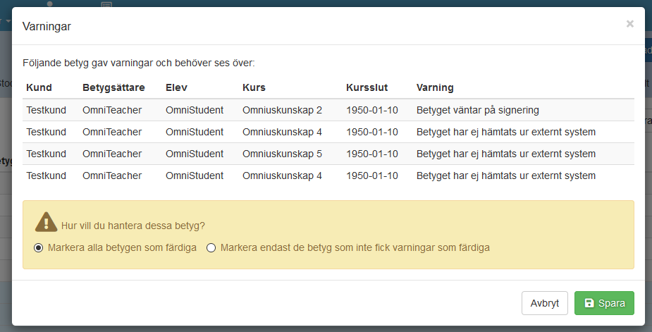 För att använda denna funktion ska du bara "markera betyg som färdiga" som tidigare. Om det finns ett betyg som inte går att markera som färdigt enligt de vanliga reglerna kommer du att få en varningsruta där du kan välja att markera alla de valda betygen som färdiga, trots varningarna. Notera att det inte finns någon begränsning gällande vilka betyg detta får göras på!