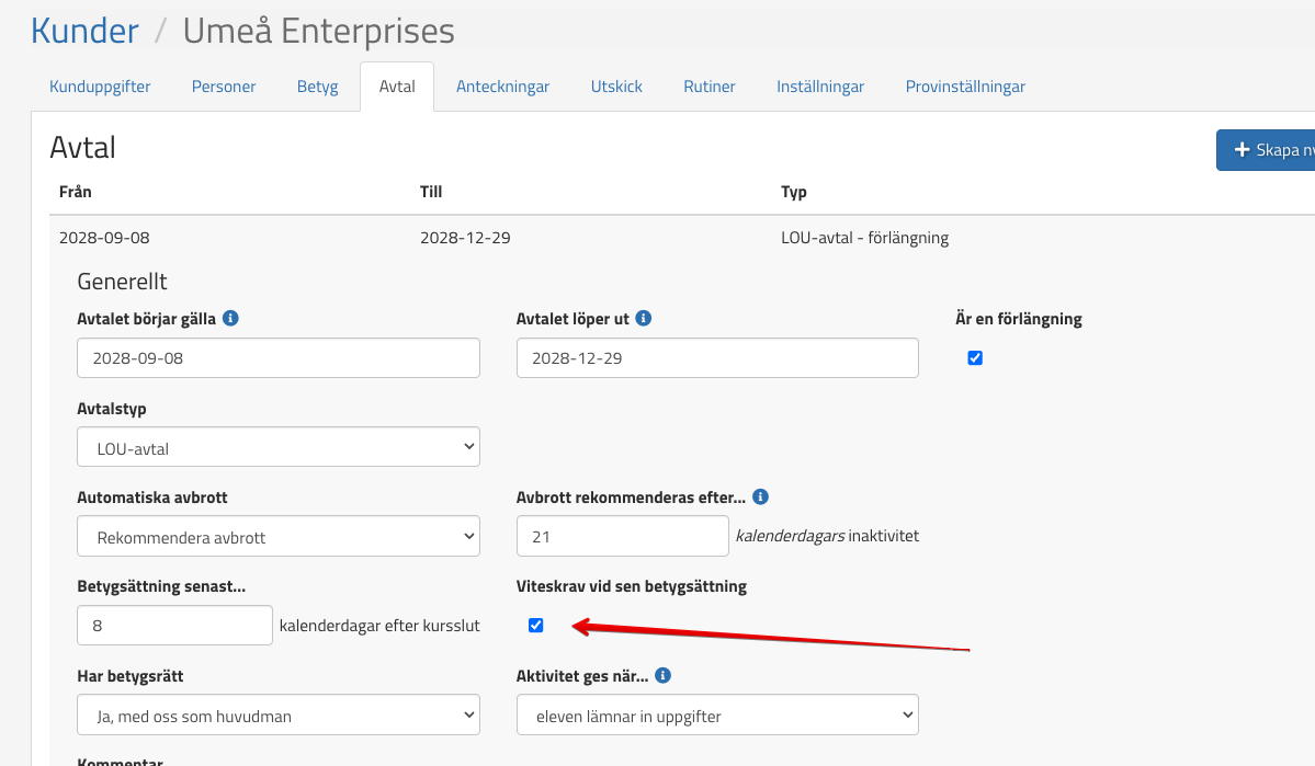 Om man i kundavtalet har kryssat i att kunden har viteskrav enligt nedan